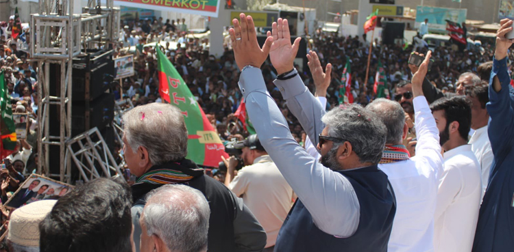 تفصیلات کے مطابق پاکستان تحریک انصاف کا سندھ حقوق مارچ آج عمرکوٹ پہنچا، جہاں پی ٹی آئی رہنما اور وزیر خارجہ شاہ محمود قریشی نے پرجوش خطاب کیا۔