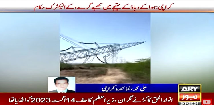کے الیکٹرک ترجمان کا کہنا ہے کہ ٹاور گرنے کے واقعے سے شہر کی بجلی فراہمی متاثر نہیں ہوئی ہے، ہائی ٹینشن پول سے کوئی سپلائی منسلک نہیں ہے۔