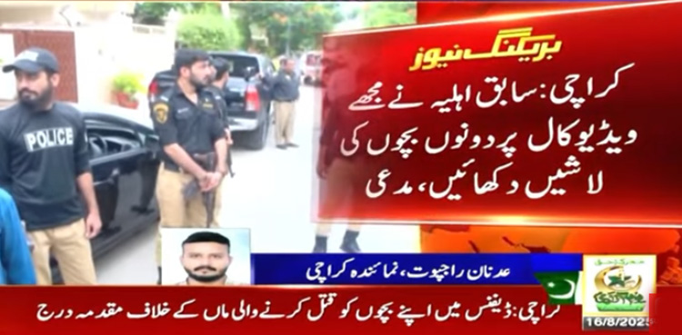 اے آر وائی نیوز کراچی کے نمائندے عدنان راجپوت کی رپورٹ کے مطابق کراچی کے علاقے ڈیفنس میں گزشتہ روز اپنے بچوں کو قتل کرنے والی ماں کے خلاف مقدمہ درج کرلیا گیا۔