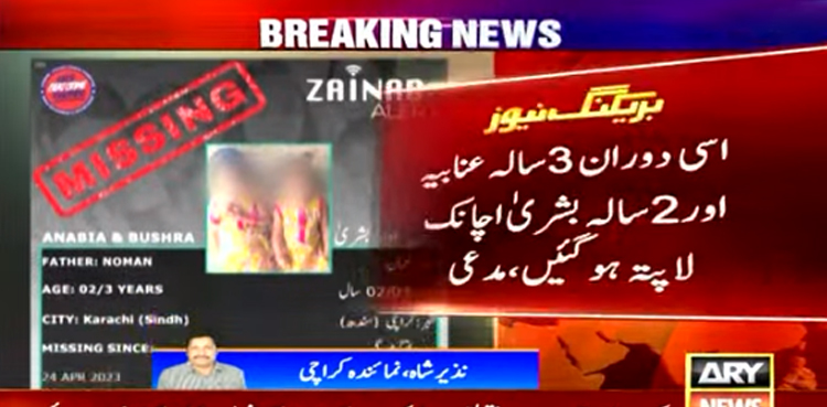مدعی مقدمہ نے بتایا کہ ہم فیملی کے ہمراہ سی ویو گھومنے گئے تھے، جہاں شام 5 بجے کباب جیز کینٹن کے پاس پہنچے اسی دوران بھانجے کی دو بیٹیاں عنابیہ اور بشری اچانک غائب ہوگئی، لاپتہ عنابیہ کی عمر 3 سال جبکہ بشری کی عمر 2 سال ہے۔