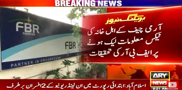 تفصیلات کے مطابق آرمی چیف کے اہل خانہ کی ٹیکس معلومات لیک ہونے پر ایف بی آر کی تحقیقات جاری ہے۔