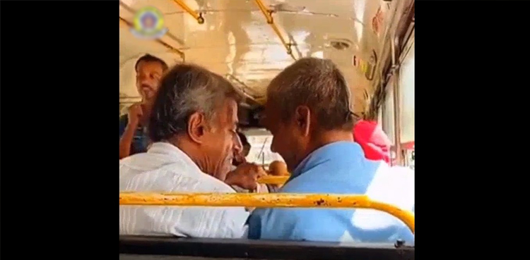 ویڈیو میں دیکھا جا سکتا ہے کہ بس میں جگہ ہونے کے باوجود دو بزرگ مسافر ایک ساتھ گھس کر بیٹھے ہیں اور آپس میں تلخ کلامی کر رہے ہیں۔