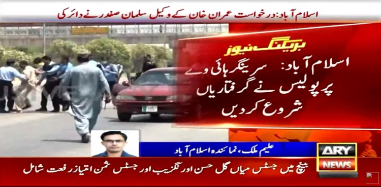 پاکستان تحریک انصاف کے چیئرمین عمران خان کی پولیس لائنز سے روانگی کے دوران کشمیر ہائی وے سے پی ٹی آئی کارکنان کی بڑی تعداد پہنچ گئی جنہیں گرفتار کرلیا گیا۔
