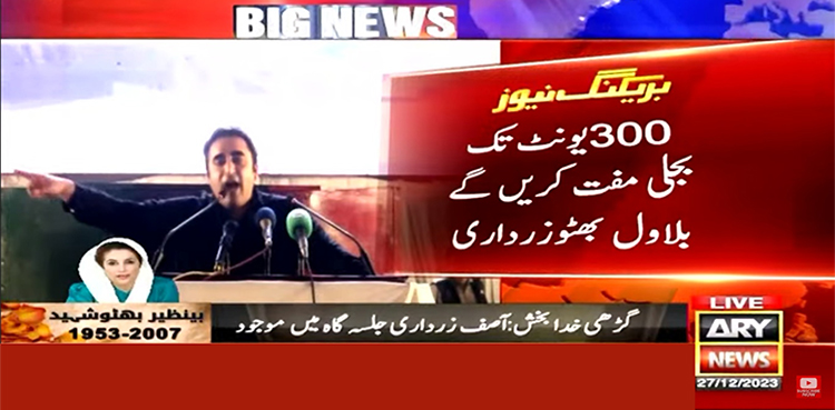 چیئرمین پیپلزپارٹی بلاول بھٹو نے اعلان کیا ہے کہ حکومت میں آئے تو 300 یونٹ کےصارفین کو سولر کے ذریعے مفت بجلی دیں گے۔