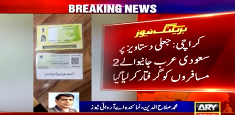 ایف آئی اے ذرائع کے مطابق جناح انٹر نیشنل ایئرپورٹ پر ایمیگریشن حکام نے کارروائی کی، اس دوران جعلی دستاویز پر سعودی عرب جانیوالے دو مسافروں کو گرفتار کرلیا گیا ہے۔