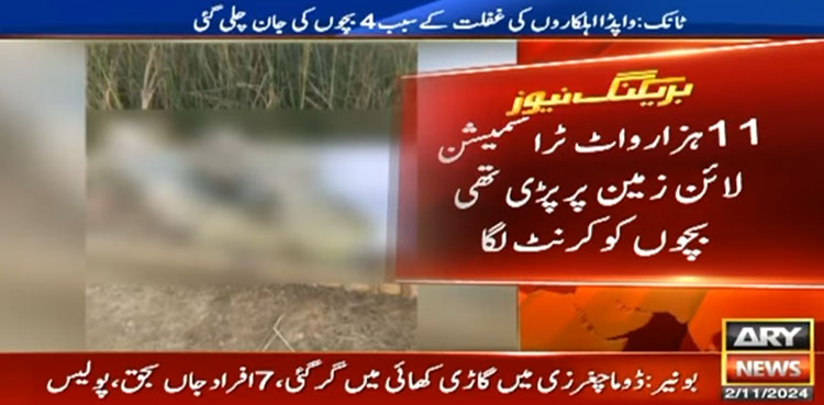 شہری نے بتایا کہ تاریں زمین پر پڑی رہیں واپڈا کو اطلاع دی کچھ نہیں کیا گیا، 11 ہزار واٹ ٹرانسمیشن لائن زمین پر پڑی تھی بچوں کو کرنٹ لگا، واپڈا اہلکاروں کی غفلت کے سبب 4 بچوں کی جان چلی گئی۔