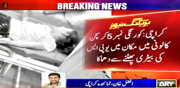 کراچی : کورنگی میں ایک گھر میں یو پی ایس کی بیٹری پھٹنے سے دھماکے کے نتیجے میں چار افراد جھلس کر زخمی ہوگئے۔