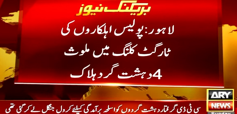 اے آر وائی نیوز کے مطابق لاہور میں پولیس اہلکاروں کی ٹارگٹ کلنگ میں ملوث چار دہشتگرد ہلاک ہوگئے جس کے بارے میں سی ٹی ڈی ترجمان کے جاری بیان میں کہا گیا ہے کہ دہشتگرد اپنے ہی ساتھیوں کی فائرنگ سے مارے گئے۔