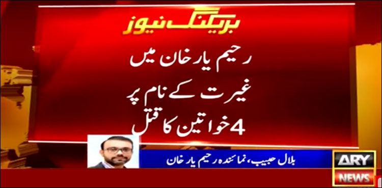 اے آر وائی نیوز کے مطابق رحیم یار خان میں کاروکاری کے الزام میں 4 خواتین کو قتل اور ایک زخمی کردیا گیا، پولیس کا کہنا ہے کہ شوہر نے بیوی اور تین بیٹیوں سمیت 4 خواتین کو قتل کیا۔