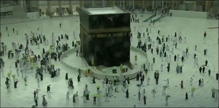 عرب میڈیا کے مطابق مکہ میں منگل 27 اپریل کو بارش اور ژالہ باری ہوئی اور مسجد الحرام میں عمرہ زائرین نے بارش کے دوران طواف ادا کیا۔