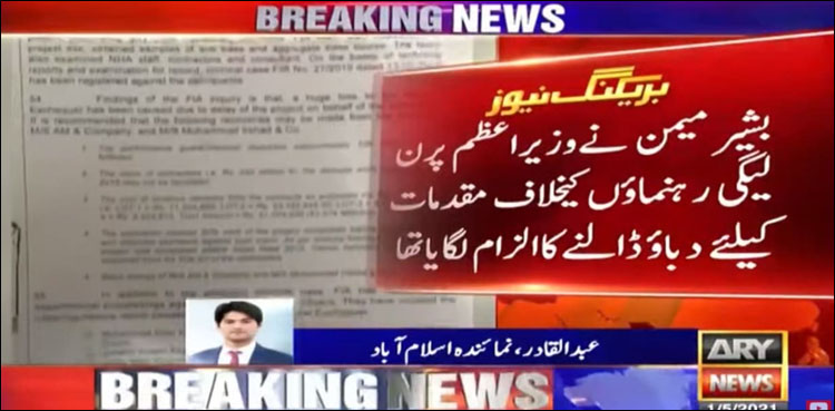 ذرائع کا کہنا ہے کہ 2007 سے 2010 کے درمیان تعمیر سڑکوں میں بے ضابطگیوں کا انکشاف ہوا تھا، ایف آئی اے نے خط لکھا تھا کہ الپوری، بشام این 90 کی تعمیر نو سے متعلق تحقیقات کی جائیں، بشیر میمن نے تحقیقات کے بعد بے ضابطگیوں، قومی خزانے کو نقصان کی تصدیق کی۔