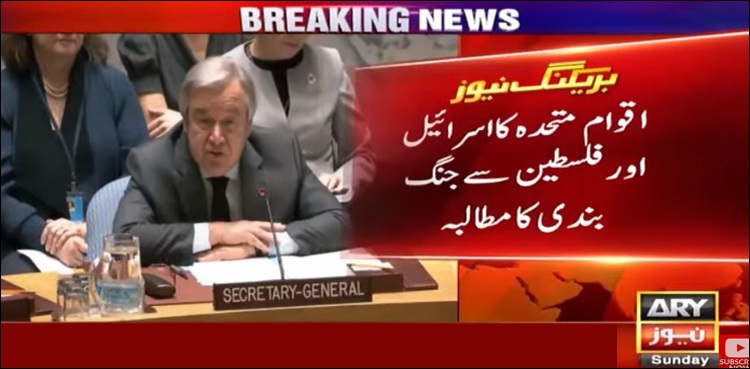 غیرملکی خبررساں ادارے کی رپورٹ کے مطابق اقوام متحدہ کے سیکریٹری جنرل انتونیو گوتریس نے سیکیورٹی کونسل کے اجلاس سے خطاب کرتے ہوئے کہا کہ فریقین دو ریاستی حل کے لیے مذاکرات کی میز پر آئیں۔