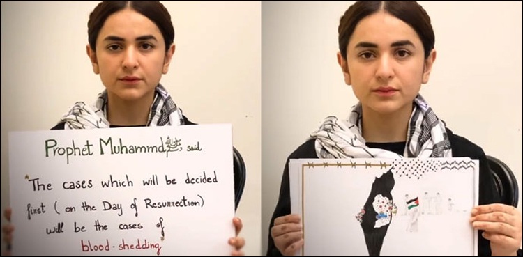 انہوں نے ہاتھ میں فلسطین سے اظہار یکجہتی کے لیے لکھے گئے پلے کارڈز تھام رکھے ہیں اور خاموشی اور افسردگی سے وہ پلے کارڈز ایک کے بعد ایک اسکرین پر دکھا رہی ہیں۔