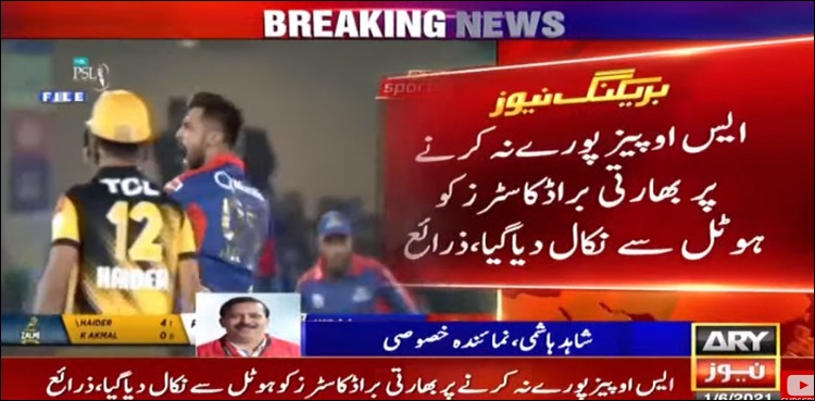 اے آر وائی نیوز کے مطابق ذرائع کا کہنا ہے کہ ایس او پیز کی خلاف ورزی پر بھارتی براڈ کاسٹر کو ہوٹل سے نکال دیا گیا، جس کے بعد پی سی بی نے بھارتی براڈ کاسٹرز کو یو اے ای سے واپس بھیج دیا۔