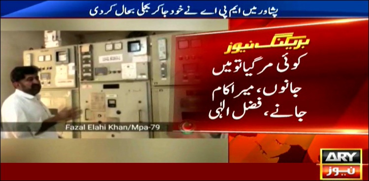 اے آر وائی نیوز کے مطابق پی ٹی آئی رکن صوبائی اسمبلی فضل الٰہی نے پشاور کے اخوند آباد گرڈ اسٹیشن میں لوگوں کے ہمراہ جاکر خود بجلی بحال کردی۔