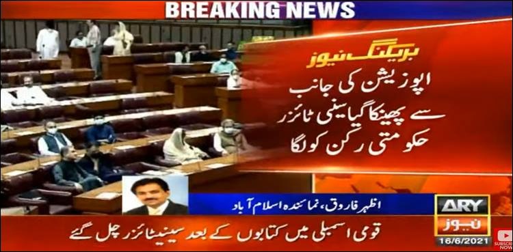 شہبازشریف کی تقریر کے دوران قومی اسمبلی میں کتابوں کے بعد سینیٹائزر چل گئے، اپوزیشن بینچوں پر بیٹھے کسی رکن نے سینیٹائزر کی بوتل حکومتی نشستوں کی طرف اچھالی جو حکومتی رکن کو جاکر لگی۔