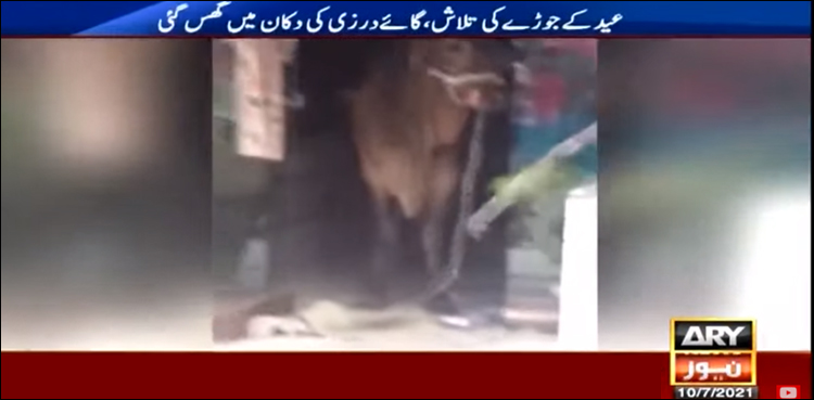 ایسی ہی ایک ویڈیو سوشل میڈیا پر وائرل ہورہی ہے جس میں گائے رسی تڑوا کر درزی کی دکان میں گھس گئی۔