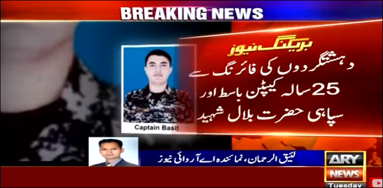 آئی ایس پی آر کے مطابق دہشت گردوں کی فائرنگ سے 25 سالہ کیپٹن باسط اور سپاہی حضرت بلال شہید ہوگئے۔