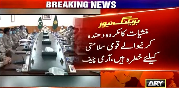چیف آف آرمی اسٹاف کا کہنا تھا کہ ’منشیات کامکروہ دھندہ کرنے والے قومی سلامتی کیلئےخطرہ اور منشیات تیار کرنے والےانسانیت کے دشمن ہیں‘۔
