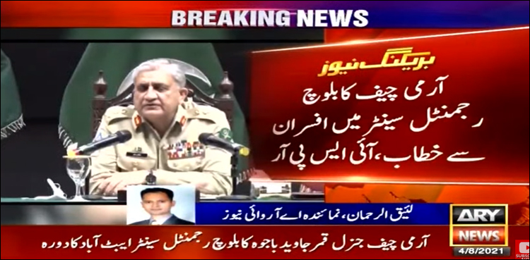 آئی ایس پی آر کے مطابق آرمی چیف کے ساتھ آئی جی آرمز کمانڈر بلوچ رجمنٹل سینٹر بھی موجود تھے، آرمی چیف کا دورہ سالانہ کمانڈنگ آفیسر کانفرنس کے موقع پر ہوا۔