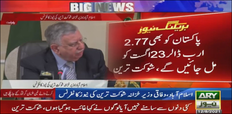 اسلام آباد: وزیر خزانہ شوکت ترین کا کہنا ہے کہ آئی ایم ایف سے پاکستان کو 2.77 ارب ڈالر 23 اگست کو مل جائیں گے۔