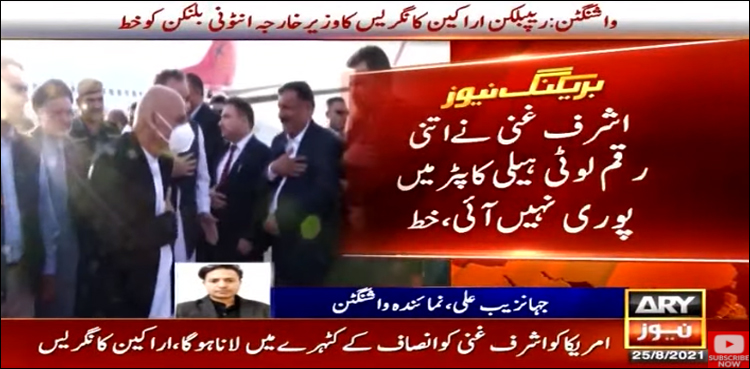 نمائندہ اے آر وائی نیوز جہانزیب علی کے مطابق ریپبلکن اراکینِ کانگریس نے وزیرخارجہ انٹونی بلنکن کو خط تحریر کیا جس میں افغان صدر اشرف غنی کو کٹہرے میں لانے کا مطالبہ کیا گیا ہے۔