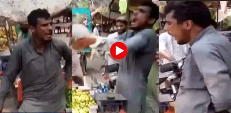 ویڈیو میں دیکھا جاسکتا ہے کہ سبزی فروش چیخ چیخ کر سبزی بیچ رہا ہے، 100 روپے کا سیب 80 روپے کلو، فلاں چیز اتنے روپے کلو میں لے جاؤ۔