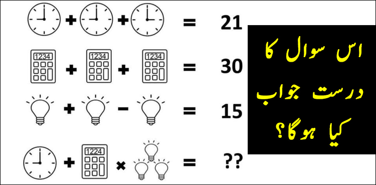آخری لائن میں ایک گھڑی ہے جس میں 9 ، دوسرے میں کیلکولیٹر ہے جبکہ تیسرے نمبر پر تین بلب ہیں، انہیں اوپر بیان کیے گئے فارمولے کے مطابق جمع اور ضرب کریں۔