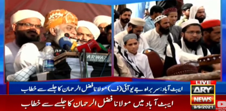 ایبٹ آباد میں جلسہ عام سے خطاب کرتے ہوئے مولانا فضل الرحمان کا کہنا تھا کہ ’ہم نے وطن عزیز کے 74سال مکمل کیے، ہمارے بزرگوں نے کامیاب زندگی کے خواب دیکھے تھے، صدیاں گزرنے کے بعد بھی وہ خواب شرمندہ تعبیر نہ ہوسکے، ہم اوپر کی طرف جانے کے بجائے نیچے کی طرف لوٹ رہے ہیں’۔