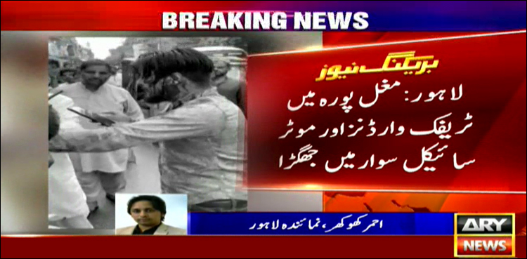 لاہور کے علاقے مغل پورہ میں ٹریفک وارڈن اور موٹر سائیکل سوار شہری میں جھگڑا ہوا اس دوران وارڈن نے شہری کا سر پھاڑ دیا۔