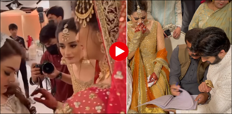 ایک ویڈیو میں دیکھا جاسکتا ہے کہ اداکار احسن محسن اکرام نکاح نامے پر دستخط کررہے ہیں اور قریب موجود اداکارہ ایمن خان فرط جذبات سے آبدیدہ ہورہی ہیں۔