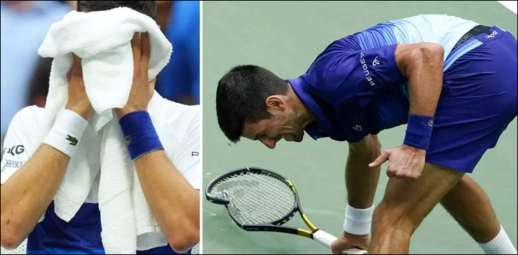 تفصیلات کے مطابق یو ایس اوپن کے فائنل میں سربین ٹینس اسٹار نواک جوکووچ کو شکست کا سامنا کرنا پڑا، جوکووچ شکست پر جذبات پر قابو نہ رکھتے ہوئے رو دئیے اور غصے میں ریکٹ بھی توڑ ڈالا۔