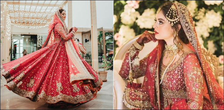 اداکارہ منال خان نے بارات کے روز سرخ رنگ کا عروسی لباس زیب تن کیا جس کے سوشل میڈیا پر خوب چرچے ہوئے۔