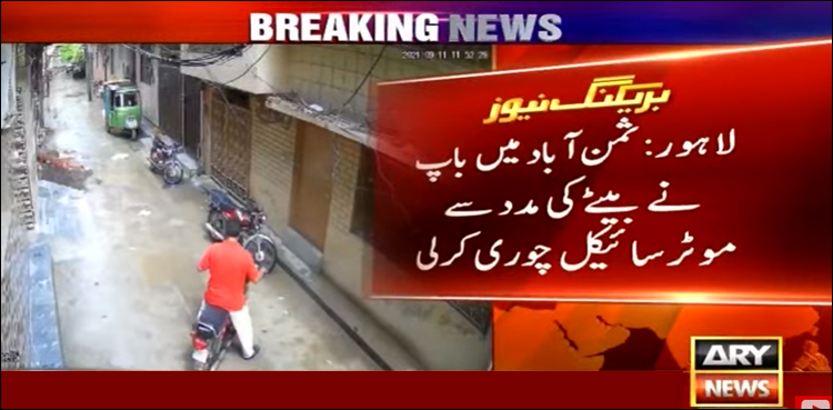 لاہور کے علاقے ثمن آباد میں باپ نے بیٹے کی مدد سے موٹر سائیکل چوری کرلی، چوری کی واردات کی سی سی ٹی وی فوٹیج منظر عام پر آگئی۔