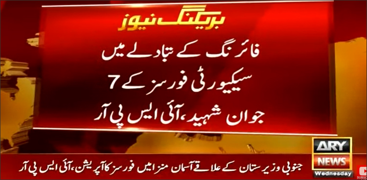 آئی ایس پی آر کے مطابق دہشت گردوں سے فائرنگ کے تبادلے میں سیکیورٹی فورسز کے 7 جوانوں نے جام شہادت نوش کیا۔
