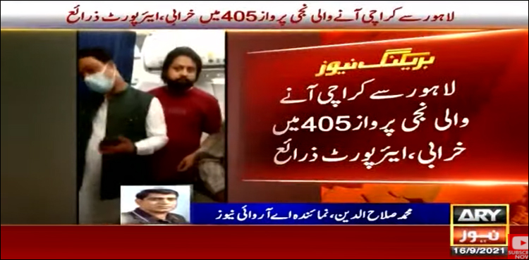 نمائندہ اے آر وائی نیوز کے مطابق لاہور سے کراچی جانے والی نجی پرواز پی اے 405 تکنیکی مسئلے کی وجہ سے تاخیر کا شکار ہوئی۔ذرائع کے مطابق خرابی کے بعد فلائٹ کو ٹیک آف پوائنٹ سے واپس رن وے پر پہنچایا گیا۔