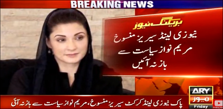 اے آر وائی نیوز کے مطابق مسلم لیگ ن کی مرکزی نائب صدر مریم نواز نے پاک نیوزی لینڈ سیریز منسوخ ہونے پر وزیراعظم عمران خان پر تنقید کرتے ہوئے لکھا کہ ’میں سبز پاسپورٹ کی عزت کرواؤں گا۔‘