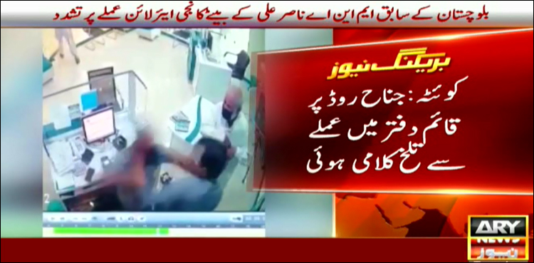 اے آر وائی نیوز کے مطابق بلوچستان کے سابق ایم این اے ناصر علی کے بیٹے نے نجی ایئرلائن کے عملے پر تشدد کیا جس کی سی سی ٹی وی فوٹیج منظرعام پر آگئی۔