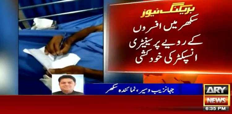 نمائندہ اے آر وائی نیوز جہانزیب وسیر کے مطابق سکھر میں میونسپل کارپوریشن افسران کی مبینہ کرپشن اور رشوت ستانی سے تنگ آکر سینیٹری نسپیکٹر نے خوکشی کرلی۔