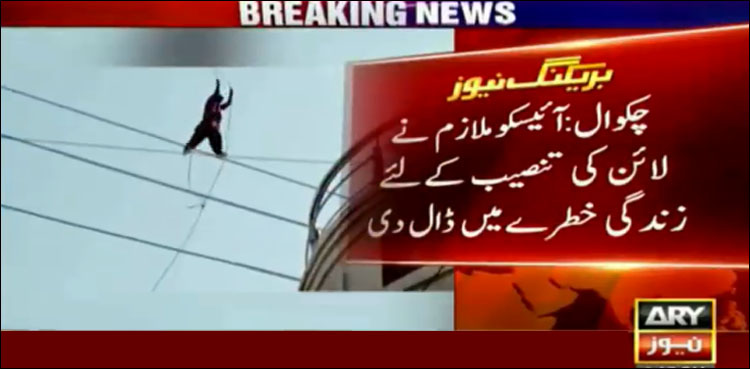 چکوال: پنجاب کے شہر چکوال میں آئیسکو کے ملازم نے لائن بچھانے کے لیے زندگی خطرے میں ڈال دی۔
