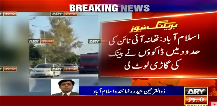 اے آر وائی نیوز کے مطابق اسلام آباد کے تھانہ آئی نائن کی حدود میں ڈاکوؤں نے بینک کی گاڑی پر حملہ کیا اور 5 ڈاکو پیسوں سے بھرے دو بیگ چھین کر فرار ہوگئے۔