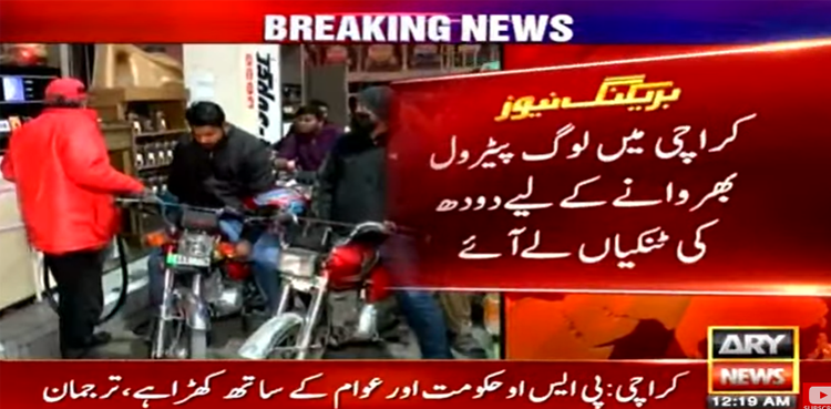 اے آر وائی نیوز کے مطابق کراچی کے مختلف علاقوں میں پٹرول پمپس بند ہوگئے جبکہ کئی علاقوں میں عوام کے رش کی وجہ سے پٹرول پمپس پر اسٹاک بھی ختم ہوگیا۔
