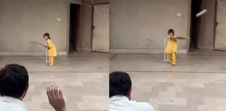 ویڈیو میں ایک شخص کو بچی کو بولنگ کرتے دیکھا جاسکتا ہے جو پل شاٹ کو درستگی کے ساتھ انجام دیتی ہے۔