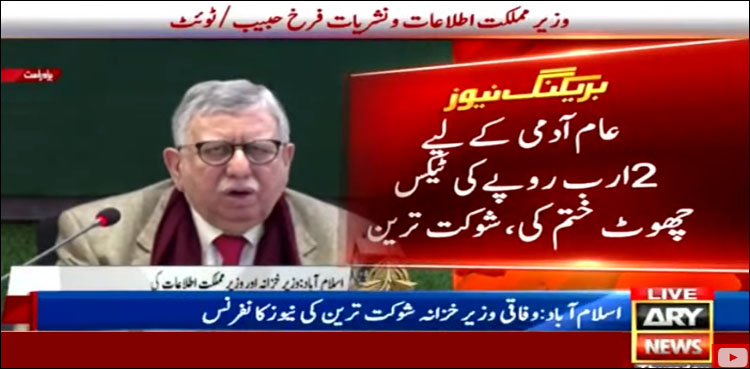 اسلام آباد: وزیر خزانہ شوکت ترین کا کہنا ہے کہ منی بجٹ میں عام آدمی کے لیے صرف 2 ارب روپے کی ٹیکس چھوٹ ختم کی گئی ہے۔