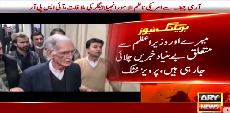 پرویز خٹک نے میڈیا سے گفتگو کرتے ہوئے کہا کہ میرے اور وزیراعظم سے متعلق بے بنیاد خبریں چلائی جارہی ہیں، وزیراعظم اور میرے متعلق جیو نے غلط رپورٹنگ کی، ٹی وی دیکھ کر حیران ہوگیا اتنا بڑا طوفان کھڑا کردیا۔