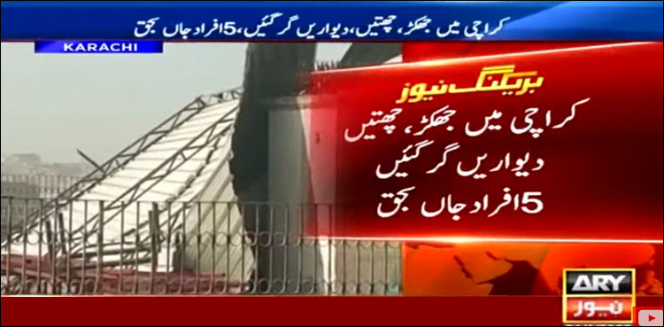 اے آر وائی نیوز کے مطابق کراچی میں تیز ہواؤں کے جھکڑ حادثات میں اضافے کا سبب بن گئے، مختلف علاقوں میں دیواریں اور چھتیں گرنے سے بچے سمیت 5 افراد جاں بحق ہوگئے۔