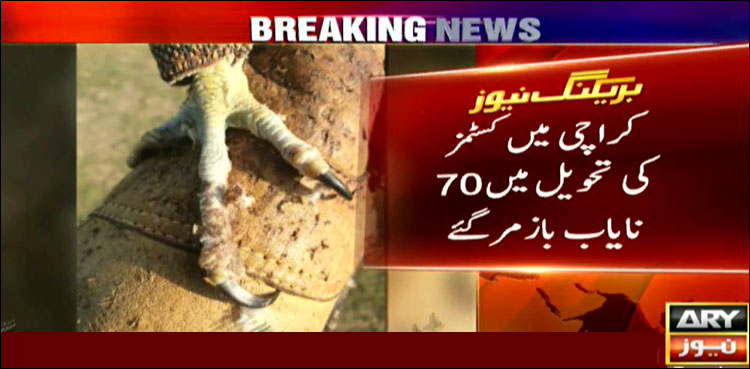 اے آر وائی نیوز کے مطابق کراچی میں کسٹم کی تحویل میں موجود 70 نایاب نسل کے باز مناسب دیکھ بھال نہ ہونے کے سبب مر گئے، ایک سال پہلے کسٹم نے کراچی کے علاقے گزری سے 75 باز برآمد کیے تھے۔