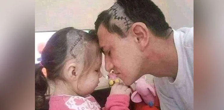 اس کے علاوہ دیکھا جاسکتا ہے کہ باپ نے بیٹی کی طرح ہی اپنے سر پر بھی سرجری کے بعد لگنے والے ٹانکوں کے نشان بنائے ہوئے ہیں۔
