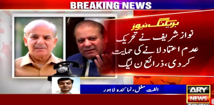 اے آر وائی نیوز کے مطابق ن لیگ ذرائع کا کہنا ہے کہ قائد حزب اختلاف شہباز شریف نے پارٹی سربراہ نواز شریف سے رابطہ کیا جس میں نواز شریف نے حکومت کے خلاف تحریک عدم اعتماد لانے کی حمایت کی۔