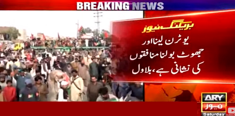 اے آر وائی نیوز کے مطابق چیئرمین پیپلزپارٹی بلاول بھٹو زرداری نے اوکاڑہ میں لانگ مارچ کے شرکا سے خطاب کرتے ہوئے کہا کہ ہم نے ڈٹ کر مقابلہ کیا اور عمران خان کو کھلا میدان نہیں دیا، ہر ضمنی الیکشن اور سینیٹ میں سیلیکٹڈ کو شکست دی۔
